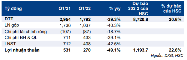 DXG công bố KQKD Q1/2022 với lợi nhuận thuần là 270 tỷ đồng (giảm 49,1% so với cùng kỳ) với doanh thu là 1.792 tỷ đồng (giảm 39,3% so với cùng kỳ). Đáng chú ý, lợi nhuận thuần Q1/2022 giảm xuống 15,1% so với 18,0% trong Q1/2021 do DXG hạ tỷ lệ sở hữu tại CTCP Dịch vụ Bất động sản Đất Xanh (DXS; Không xếp hạng) xuống 60,3% tính đến ngày 31/3/2022, từ 84,2% tính đến ngày 31/3/2021. Mức nền cao trong Q1/2021 cũng góp phần vào sự giảm tăng trưởng của KQKD Q1/2022.