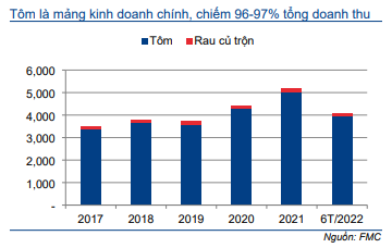FMC chủ yếu xuất khẩu tôm, đóng góp 96-97% tổng doanh thu trong 5 năm qua. Ngoài ra, Công ty còn có mảng xuất khẩu rau củ trộn, đóng góp 3-4% tổng doanh thu.