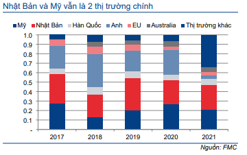Thị trường Mỹ: Mỹ là thị trường lớn thứ 2 của FMC, chiếm 22% giá trị xuất khẩu của Công ty trong giai đoạn 2017-2021. Sản lượng xuất khẩu của Công ty sang thị trường Mỹ biến động giữa các năm, tùy thuộc vào mức thuế chống bán phá giá tại thị trường này. Trong giai đoạn 2017-2021, doanh thu xuất khẩu sang thị trường Mỹ tăng trưởng vừa phải với tốc độ CAGR 3,2% mặc dù thuế chống bán phá giá vẫn là 0%. Công ty đã thận trọng trong việc đẩy mạnh doanh thu tại thị trường Mỹ vì rủi ro thuế chống bán phá gia tăng và sự cạnh tranh gay gắt từ Ấn Độ, Ecuador và các doanh nghiệp xuất khẩu tôm khác của Việt Nam.