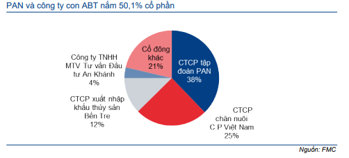 - PAN sở hữu trực tiếp 37,8% cổ phần FMC. CTCP Xuất nhập khẩu Thủy sản Bến Tre (ABT, Không xếp hạng) – công ty con do PAN nắm 76,5% cổ phần – nắm 12,4% cổ phần FMC. Theo đó, tỷ lệ lợi ích của PAN tại FMC là 50,1% và là công ty mẹ của FMC.
