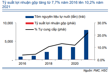 Tỷ suất lợi nhuận gộp cải thiện từ 7,8% trong năm 2017 lên 10-11% trong giai đoạn 2018-2021, một phần nhờ sản lượng tôm nguyên liệu tự nuôi tăng. Trong năm 2017, tỷ trọng tôm nguyên liệu tự nuôi chỉ đóng góp 4,4%. Tuy nhiên, tỷ trọng này đã tăng lên hơn 10% trong năm 2018 và 20% trong năm 2021, sau khi FMC mở rộng diện tích nuôi tôm.