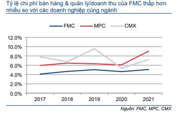 Chi phí bán hàng & quản lý của FMC được kiểm soát tốt. Tỷ lệ chi phí bán hàng & quản lý/doanh thu vào khoảng 5%, thấp hơn so với các doanh nghiệp cùng ngành là 7-9%.