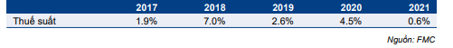Do đó, trong 5 năm qua, mức thuế TNDN hiện hành của FMC ở mức rất thấp, dao động trong khoảng 0,6%-7,0%. Thuế suất thuế TNDN hiện hành trong năm 2021 chỉ là 0,6%.
