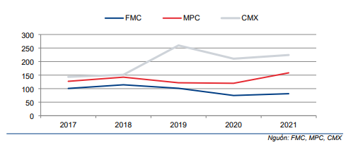 Nhờ số ngày tồn kho và số ngày phải thu thấp hơn, chu kỳ chuyển đổi tiền mặt của FMC ngắn hơn đáng kể so với MPC và CMX.