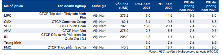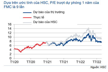 Hiện FMC có P/E trượt dự phóng 1 năm là 9 lần, cao hơn 0,8 độ lệch chuẩn so với bình quân quá khứ (từ tháng 1/2018). Định giá hiện tại của FMC là hợp lý nếu nhìn vào triển vọng lợi nhuận tích cực nhờ nhu cầu tăng cao, Công ty mở rộng công suất và biên lợi nhuận cải thiện. Hiện P/E dự phóng năm 2022 là 10,1 lần; cao hơn 34% so với các doanh nghiệp cùng ngành trong nước. Tuy nhiên, mức chênh lệch định giá này theo HSC là có cơ sở vì FMC có các chỉ số sinh lời tốt hơn.