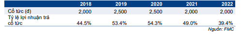 Nhờ dòng tiền mạnh và lợi nhuận ổn định, chính sách cổ tức của FMC cũng ổn định, với mức cổ tức tiền mặt dao động trong khoảng 1.500-3.000đ/cp trong giai đoạn 2018- 2021, tương đương tỷ lệ lợi nhuận chi trả cổ tức trong kỳ dao động trong khoảng 39- 54%. Tại ĐHCĐ năm 2022, mức cổ tức bằng tiền mặt được đề xuất và thông qua là 2.000đ/cp cho năm 2022, tương đương với tỷ lệ lợi nhuận chi trả cổ tức là 39% (dựa trên dự báo lợi nhuận của chúng tôi) và lợi suất cổ tức là 4,1% theo thị giá hiện tại.