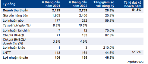 Theo đó, FMC hoàn thành lần lượt 44,2% và 44,6% kế hoạch doanh thu thuần và LNTT đề ra cho cả năm 2022.