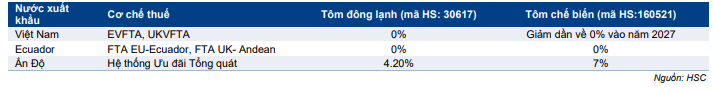 Hiệp định thương mại tự do EU-Việt Nam (EVFTA) và Hiệp định thương mại tự do Anh-Việt Nam (UKVFTA) đã có hiệu lực vào cuối năm 2020. Theo EVFTA và UKVFTA, thuế áp vào tôm đông lạnh xuất khẩu vào thị trường Châu Âu và Anh đã về không từ cuối năm 2020 và thuế áp vào tôm chế biến sẽ giảm dần trong 7 năm tới; tạo điều kiện để tôm Việt Nam giành thị phần tại thị trường Châu Âu và Anh từ Ấn Độ và Ecuador.