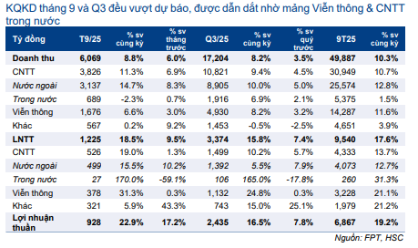Dựa trên KQKD Q3/2025 cao hơn kỳ vọng, doanh thu thuần/lợi nhuận thuần 9 tháng đầu năm 2025 của FPT hoàn thành lần lượt 70,2%/75,9% dự báo cho cả năm 2025 của chúng tôi.