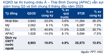 Trong mảng Dịch vụ CNTT nước ngoài, doanh thu tại thị trường Nhật Bản và EU tiếp tục tăng mạnh trong Q3/2025, lần lượt ở mức 23% so với cùng kỳ (tăng 3,6% so với quý trước) và tăng 40,6% so với cùng kỳ (tăng 11,5% so với quý trước). Doanh thu tại thị trường Mỹ tăng 6,1% so với cùng kỳ (tăng 1,9% so với quý trước) trong khi doanh thu tại Châu Á-Thái Bình Dương giảm 14,5% so với cùng kỳ (nhưng phục hồi 8,1% so với quý trước).