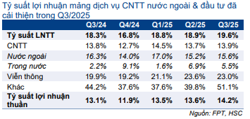 Như được trình bày trong Bảng 3, tỷ suất LNTT trong Q3/2025 của FPT đạt mức cao kỷ lục 19,6%, cao hơn nhiều so với mức 18,3% trong Q3/2024 và 18,9% trong Q2/2025. Tỷ suất lợi nhuận cải thiện chủ yếu dựa trên hai yếu tố: (1) Cơ cấu sản phẩm thuận lợi: Đóng góp cao hơn từ những phân khúc có tỷ suất lợi nhuận cao và (2) sự cải thiện ở các phân khúc dịch vụ: Khả năng sinh lời của các phân khúc dịch vụ riêng lẻ được cải thiện.