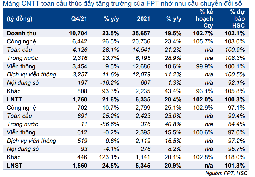 Bảng 1: KQKD Q4/2021 và cả năm 2021 so với kế hoạch Công ty và dự báo của HSC, FPT