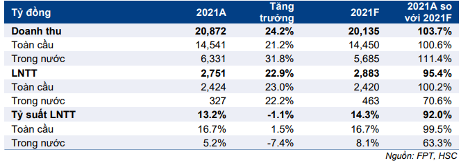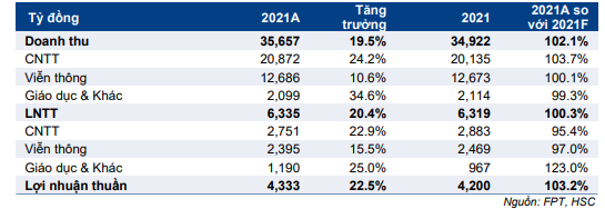 Cổ phiếu FPT công bố KQKD năm 2021 với doanh thu tăng trưởng 19,5% đạt 35.657 tỷ đồng trong khi lợi nhuận thuần tăng trưởng 22,5% đạt 4.333 tỷ đồng, vượt lần lượt 2,1% và 3,2% dự báo doanh thu và lợi nhuận thuần năm 2021 của chúng tôi.