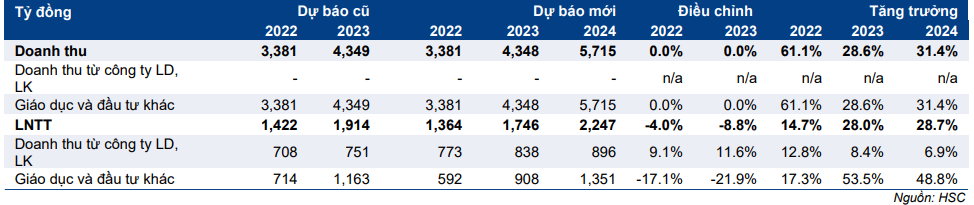 Giáo dục và đầu tư khác: HSC hạ lần lượt 17,1% và 21,9% dự báo LNTT năm 2022 và 2023, trong khi đưa ra dự báo lần đầu cho năm 2024 với LNTT tăng trưởng 48,8%.