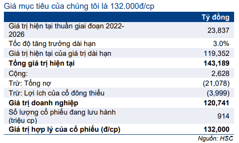 HSC nâng 3,0% giá mục tiêu lên 132.000đ (tiềm năng tăng giá: 23%). Giá cổ phiếu của FPT đã tăng mạnh, cao hơn 17% so với mức tăng chung của thị trường trong 3 tháng qua. Tiềm năng tăng trưởng dài hạn mạnh mẽ sẽ thể hiện rõ trong giai đoạn 2022-2024 và chưa được phản ánh toàn bộ vào giá cổ phiếu. HSC duy trì khuyến nghị Mua vào.