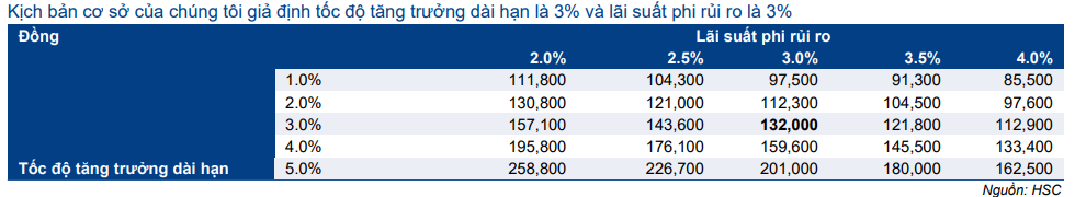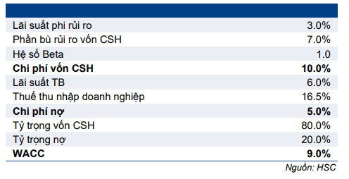 Chúng tôi duy trì giả định đối với mô hình DCF với lãi suất phi rủi ro là 3,0%, phần bù rủi ro vốn CSH là 7,0%, WACC là 9,0% và tốc độ tăng trưởng dài hạn là 3,0%.