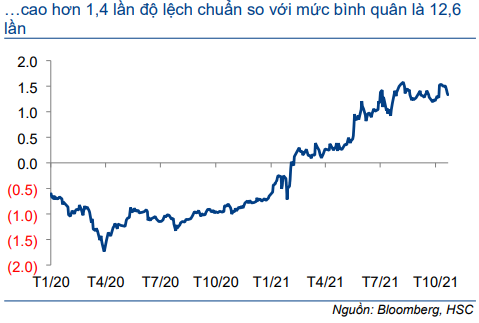 FPT hiện đang giao dịch với P/E dự phóng 2022 là 18,1 lần, giảm xuống 14,6 lần trong năm 2023, tương đương với P/E trượt dự phóng 1 năm là 17,1 lần, cao hơn 1,4 lần độ lệch chuẩn so với mức bình quân là 12,6 lần tính từ tháng 1/2020. Tại giá mục tiêu mới của chúng tôi, tiềm năng tăng giá của cổ phiếu FPT là 23% so với thị giá hiện tại.