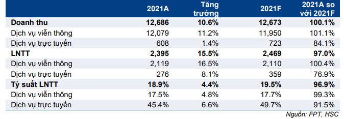 Bảng 3: KQKD thực tế mảng viễn thông năm 2021 so với dự báo, FPT