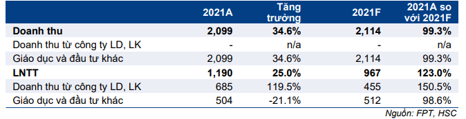 KQKD mảng giáo dục trong năm 2021 cũng khả quan với doanh thu tăng trưởng 40% nhờ số lượng sinh viên tăng trưởng 43%. FPT không công bố lợi nhuận của riêng mảng giáo dục, nhưng HSC cho rằng tăng trưởng lợi nhuận đã vượt mức dự báo của chúng tôi là tăng trưởng 30%.