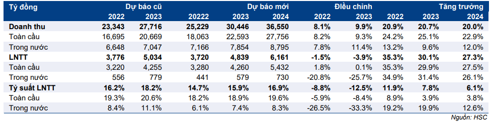 Bảng 5: Dự báo lợi nhuận giai đoạn 2022-2024 mới so với dự báo cũ, FPT