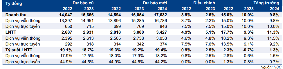 HSC cũng nâng lần lượt 4,6% và 4,8% dự báo LNTT năm 2022 và 2023, theo đó tỷ suất LNTT tăng lên 18,0% và 17,9% từ 17,9% và 17,5% do trong tổng số khách hàng sử dụng dịch vụ Internet, tỷ trọng khách hàng sử dụng dịch vụ truyền hình trả phí đã vượt kỳ vọng của chúng tôi.