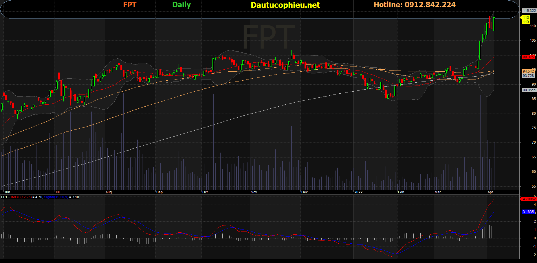 Đồ thị cổ phiếu cổ phiếu FPT phiên giao dịch ngày 06/04/2022. Nguồn: AmiBroker