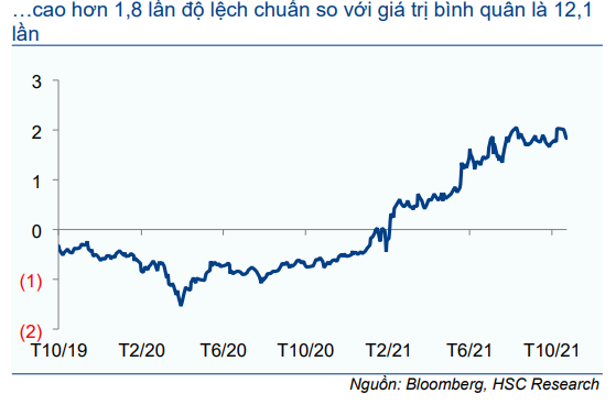 FPT hiện đang giao dịch với P/E dự phóng 2021 là 20,9 lần, giảm xuống 17,5 lần trong năm 2022, tương đương với P/E trượt dự phóng 1 năm là 18,0 lần, cao hơn 1,8 lần độ lệch chuẩn so với mức bình quân là 12,1 lần, (tính từ tháng 10/2019).