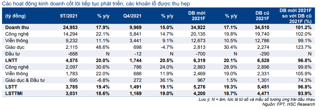 Bảng 2: Dự báo mới quý 4 và cả năm 2021 so với ước tính cũ, FPT