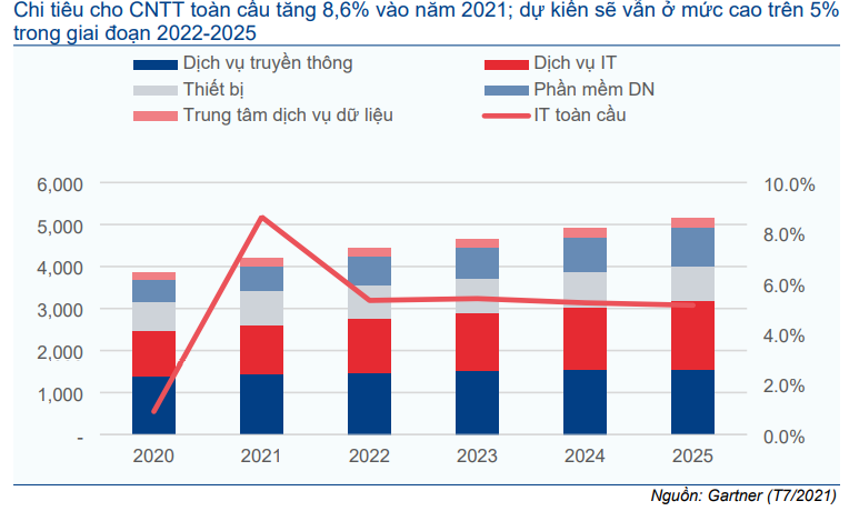 Công ty phân tích Gartner dự báo chi tiêu CNTT toàn cầu sẽ tăng trưởng 8,6% trong năm 2021. Đây là mức tăng trưởng mạnh so với năm 2020. Thời gian tới, Gartner dự báo thị trường này sẽ tăng trưởng từ 5%/năm trở lên trong giai đoạn 2022-2025. Trọng tâm đầu tư đang chuyển từ phần cứng sang phần mềm, các dịch vụ dựa trên điện toán đám mây và các dịch vụ quản lý. Chi tiêu cho phần mềm được dự báo sẽ tăng trưởng khoảng 11-12,5% trong giai đoạn 2022-2025.