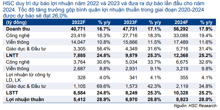 HSC duy trì dự báo lợi nhuận năm 2022 và 2023 do chúng tôi đã bao gồm tác động của dịch COVID-19 lên tăng trưởng nhu cầu và năng lực phân phối của FPT.