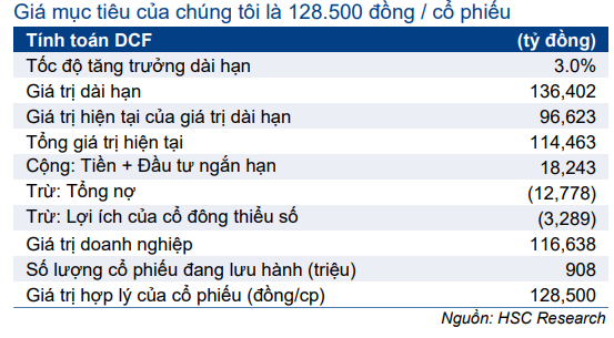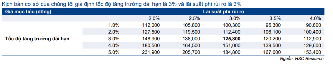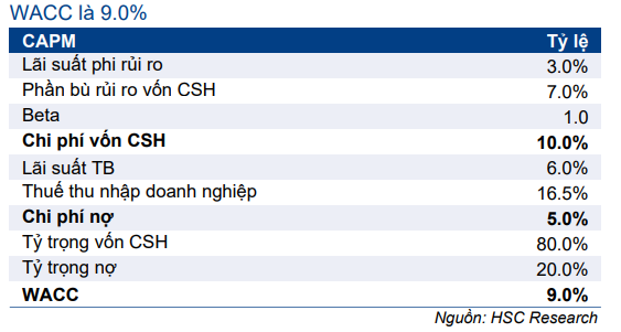 Chúng tôi duy trì giả định đối với mô hình DCF với lãi suất phi rủi ro là 3,0%, phần bù rủi ro vốn CSH là 7,0%, hệ số beta là 1,0 lần và tốc độ tăng trưởng dài hạn là 3,0%.