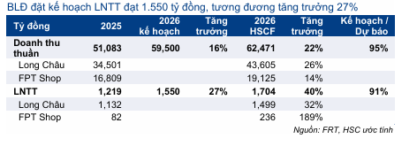 BLĐ đặt kế hoạch doanh thu thuần năm 2026 đạt 59.500 tỷ đồng (tăng trưởng 16%) và LNTT đạt 1.550 tỷ đồng (tăng trưởng 27%), trong đó phần lớn đóng góp dự kiến đến từ chuỗi Long Châu. Kế hoạch doanh thu của FRT thấp hơn 5% so với dự báo của HSC (62.471 tỷ đồng) trong khi kế hoạch LNTT thấp hơn 9% so với dự báo (1.704 tỷ đồng). Chúng tôi cho rằng kế hoạch này mang tính thận trọng, phản ánh quan điểm dè dặt của BLĐ trong bối cảnh biến động vĩ mô gần đây có thể ảnh hưởng đến nhu cầu tiêu dùng.