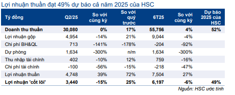 GAS ghi nhận lợi nhuận thuần Q2/2025 đạt 4,7 nghìn tỷ đồng, tăng 39% so với cùng kỳ và tăng 72% so với quý trước. Lợi nhuận HĐKD cốt lõi nửa đầu năm 2025 đạt 6,2 nghìn tỷ đồng, giảm 6,2% so với cùng kỳ và đạt 49% dự báo cả năm của HSC.