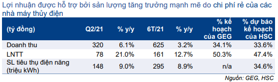 Doanh thu lũy kế 6 tháng đầu năm đạt 625 tỷ đồng (tăng 3,2% so với cùng kỳ) và LNTT đạt 161 tỷ đồng (tăng 12,7% so với cùng kỳ), đạt lần lượt 33,6% và 47,4% dự báo doanh thu và LNTT năm 2021 của chúng tôi. Doanh thu và LNTT đều sát với dự báo của chúng tôi; chúng tôi kỳ vọng lợi nhuận sẽ bùng nổ vào Q4/2021 khi nhà máy điện gió với công suất 130MW của GEG sẽ đi vào hoạt động.