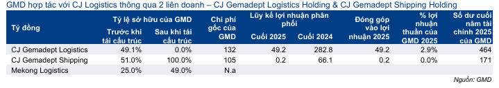 Trong năm 2025, đóng góp lợi nhuận từ CJ Gemadept Logistics là 49,2 tỷ đồng (bằng 2,9% lợi nhuận thuần năm 2025 của GMD), trong khi đóng góp từ CJ Gemadept Shipping hầu như không có.