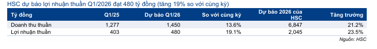 HSC đang xem xét lại khuyến nghị và giá mục tiêu sau khi giá cổ phiếu tăng mạnh trong thời gian gần đây. Dự báo hiện tại cho năm 2026 cho thấy lợi nhuận thuần tăng trưởng 22% đạt 2.045 tỷ đồng.
