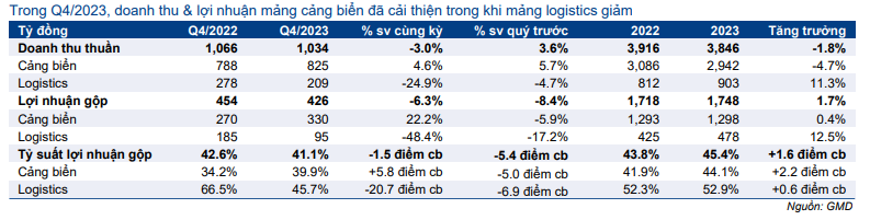 - Nhờ đó, doanh thu thuần Q4/2023 đạt 1,03 nghìn tỷ đồng, giảm 3% so với cùng kỳ do doanh thu mảng logistic giảm, nhưng tăng 4% so với quý trước nhờ sản lượng hàng hóa qua cảng tăng. Doanh thu sát với dự báo của chúng tôi.