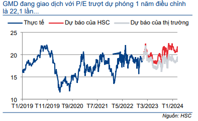 Sau khi giá cổ phiếu tăng 11% trong 3 tháng qua, Cổ phiếu GMD đang giao dịch với P/E trượt dự phóng 1 năm là 22,1 lần, cao hơn 1,6 độ lệch chuẩn so với bình quân từ tháng 1/2019 ở mức 18,2 lần. Nhờ triển vọng lợi nhuận mạnh mẽ, HSC tin rằng GMD sẽ được định giá lại ở mặt bằng cao hơn.