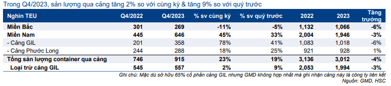 Trong Q4/2023, GMD ghi nhận lợi nhuận 72 tỷ từ GIL so với lỗ 22 tỷ trong Q4/2022 và lỗ 6 tỷ trong Q3/2023. GIL có lãi chủ yếu nhờ sản lượng qua cảng phục hồi mạnh. Trong Q4/2023, cảng GIL tiếp nhận xử lý 358.200 TEU hàng hóa (tăng 78% so với cùng kỳ và tăng 41% so với quý trước). Sản lượng hàng hóa qua cảng tăng lên nhờ nhu cầu phục hồi ở khu vực cảng Cái Mép Thị Vải (CMTV) và cảng GIL tiếp nhập thêm tàu mới. Cụ thể như sau:
