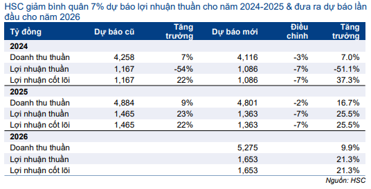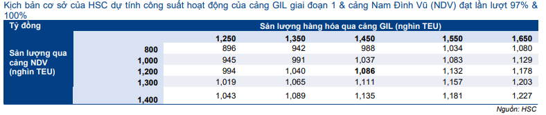 Cho năm 2026, HSC dự báo doanh thu thuần và lợi nhuận thuần đạt lần lượt 5,3 nghìn tỷ đồng (tăng trưởng 10%) và 1,7 nghìn tỷ đồng (tăng trưởng 21,3%). Động lực tăng trưởng lợi nhuận chính sẽ là mức tăng trưởng sản lượng hàng hóa qua cảng GIL và NĐV (lần lượt tăng trưởng 35% và 13%) nhờ các dự án đầu tư giai đoạn mới đi vào hoạt động.
