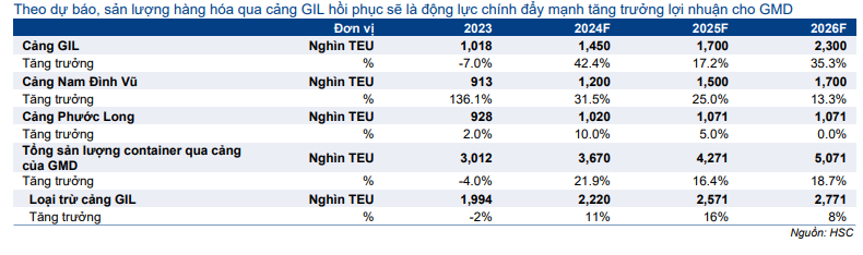 Cho năm 2025, HSC dự báo doanh thu thuần và lợi nhuận thuần đạt lần lượt 4,8 nghìn tỷ đồng (tăng trưởng 16,7%) và 1,4 nghìn tỷ đồng (tăng trưởng 26%). Chúng tôi dự báo sản lượng hàng hóa qua cảng NĐV và GIL sẽ đạt lần lượt 1,5 triệu TEU (tăng trưởng 25%) và 1,7 triệu TEU (tăng trưởng 17%) trong năm 2025. Cảng NĐV giai đoạn 3 và cảng GIL giai đoạn 2, dự kiến đi vào hoạt động lần lượt vào nửa đầu năm 2025 và Q4/2025, cũng sẽ giúp lợi nhuận GMD cải thiện.