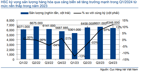 HSC tin rằng ngành cảng biển Việt Nam sẽ ghi nhận sản lượng hàng hóa qua cảng tăng trưởng mạnh trong năm 2024, đặc biệt là trong Q1/2024 nhờ mức nền thấp cùng kỳ năm ngoài (sản lượng hàng hóa qua cảng đã chạm đáy trong Q1/2023 do các khách hàng chủ chốt đồng loạt cắt giảm đơn hàng). Trên thực tế, theo Cục Hàng hải Việt Nam, tổng sản lượng container qua mọi cảng của Việt Nam phục hồi mạnh 27% so với cùng kỳ đạt 4,05 triệu TEU trong 2 tháng đầu năm 2024. Cùng kỳ năm ngoái, sản lượng hàng hóa qua cảng 2 tháng đầu năm 2023 giảm 18% so với cùng kỳ.