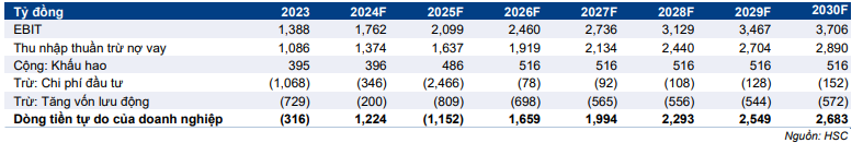 Sau khi hoàn thành giai đoạn 2, tổng công suất thiết kế cảng GIL sẽ được bổ sung thêm 2,3 triệu TEU/năm, tăng 66% so với công suất hiện tại. Những dự án đầu tư mới này sẽ là động lực chính giúp lợi nhuận GMD tăng trưởng dài hạn do cả hai đều có vị trí chiến lược tại các trung tâm container tấp nập nhất Việt Nam. Lưu ý rằng mô hình dự báo của HSC đã tính đến các dự án đầu tư này. Chúng tôi kỳ vọng các dự án mới này của GMD sẽ đạt công suất hoạt động tối đa vào năm 2028, sau 2-3 năm hoạt động.