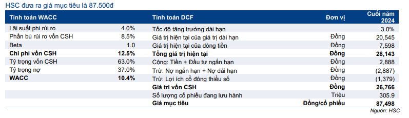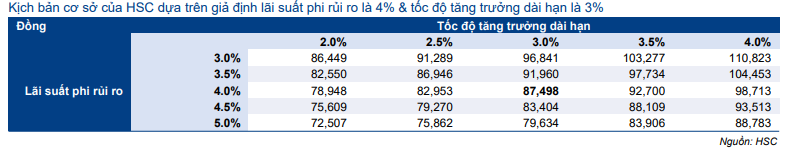 HSC duy trì các giả định định giá với lãi suất phi rủi ro là 4%, phần bù rủi ro vốn CSH là 8,5%, tốc độ tăng trưởng dài hạn là 3% và beta là 1.