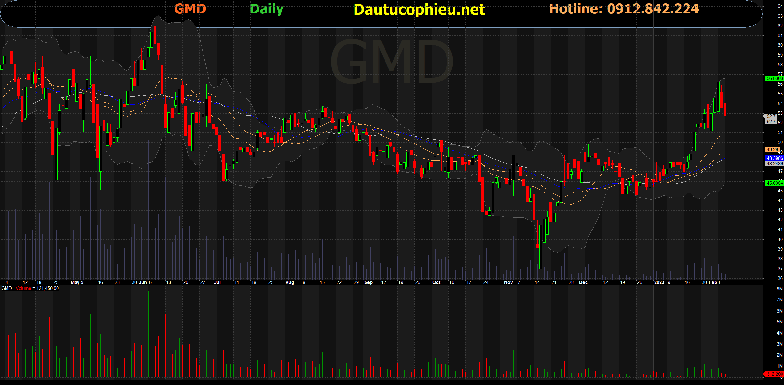 Đồ thị cổ phiếu GMD phiên giao dịch ngày 08/02/2023. Nguồn: AmiBroker