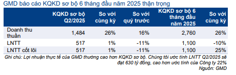Bảng 1: KQKD sơ bộ 6 tháng đầu năm 2025, GMD