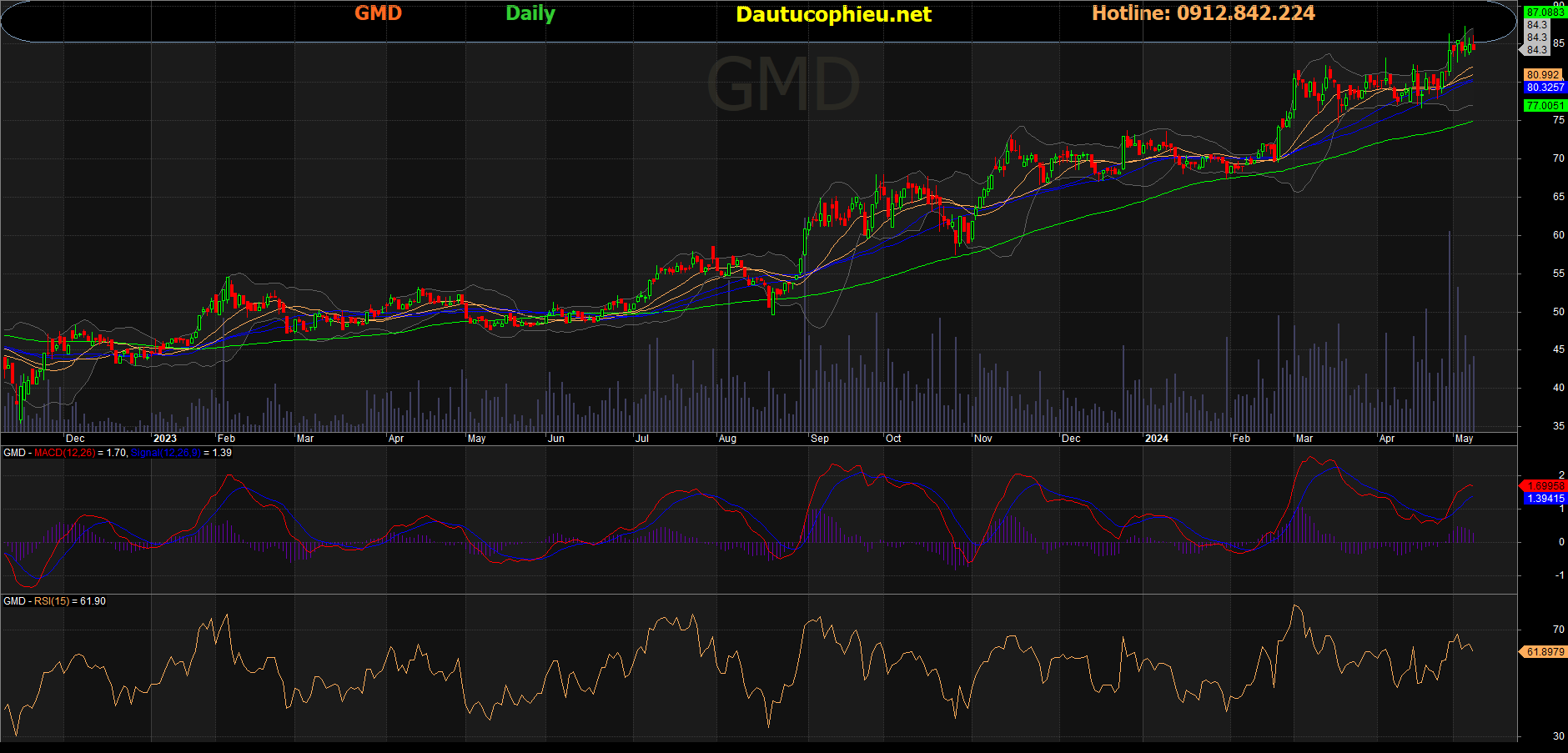 Đồ thị cổ phiếu GMD phiên giao dịch ngày 08/05/2024. Nguồn: AmiBroker