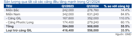 - Trong Q1/2024, GMD đã ghi nhận 48 tỷ đồng lợi nhuận từ GIL so với khoản lỗ 39 tỷ đồng trong Q1/2023, chủ yếu nhờ vào sự tăng trưởng mạnh về sản lượng hàng hóa qua cảng này. GIL đã xử lý 352.000 TEU hàng hóa trong Q1/2024, tăng 110% so với cùng kỳ, nhờ sự phục hồi nhu cầu và các tuyến dịch vụ mới được tiếp nhận từ Q4/2023. Công suất hoạt động của GIL trong Q1/2024 đạt 94% so với 45% trong Q1/2023.