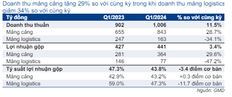 - Doanh thu mảng cảng biển đạt 842 tỷ đồng (tăng 29% so với cùng kỳ) nhờ sản lượng hàng hóa qua cảng phục hồi. Trong Q1/2024, GMD đã tiếp nhận xử lý 556.000 TEU hàng hóa, tăng 34% so với cùng kỳ. Trong đó, cảng Hải Phòng xử lý 276.760 TEU hàng hóa (tăng 14% so với cùng kỳ) và cảng Phước Long xử lý 279.240 TEU (tăng 60% so với cùng kỳ).