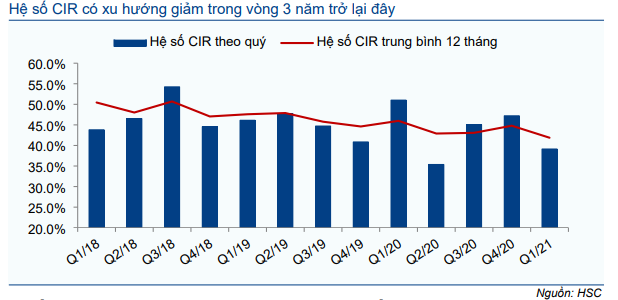 Tuy nhiên, do HDB đang trong giai đoạn mở rộng và chi phí hoạt động biến động đáng kể giữa các quý, nên HSC chỉ lần lượt giảm nhẹ 1%; 1% và 0,5% dự báo chi phí hoạt động trong năm 2021, 2022 và 2023. Chúng tôi kỳ vọng hệ số CIR hợp nhất sẽ ổn định ở khoảng 44% (Biểu đồ 8).
